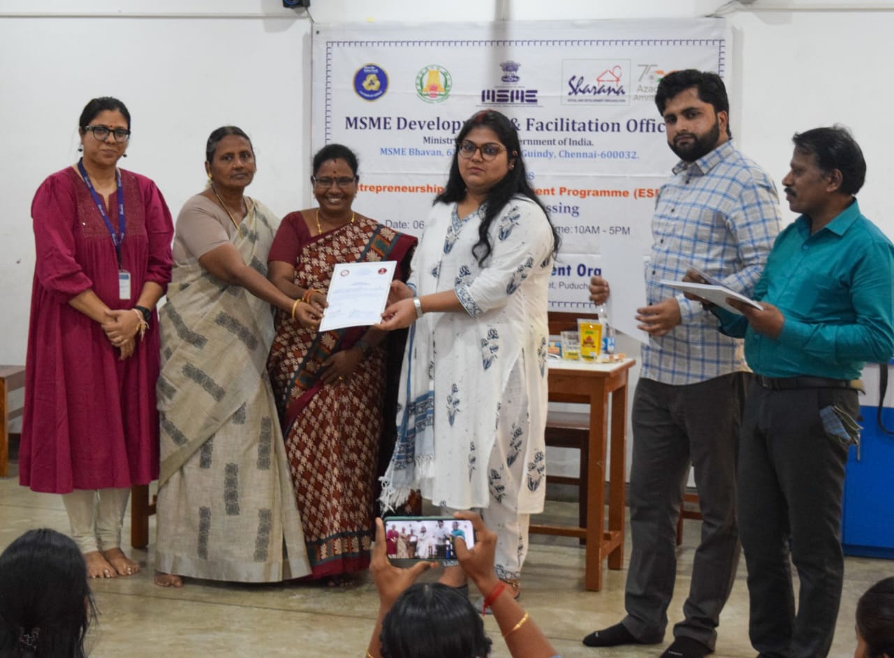The closing ceremony brought together everyone who made this journey possible. We were honoured to welcome Dr. Altaf Ahmed, Assistant Director, MSME–DFO, Chennai, and Preetika Sharma, Assistant Director, MSME Testing Station, Puducherry. They were joined by Vandana Shah, Operations Director of Sharana, Mr. Siddheshwaran, MSME Consultant & Career Development Coach, A. Prakash, Program Manager, the course instructors, and Sharana’s dedicated team of women social workers.