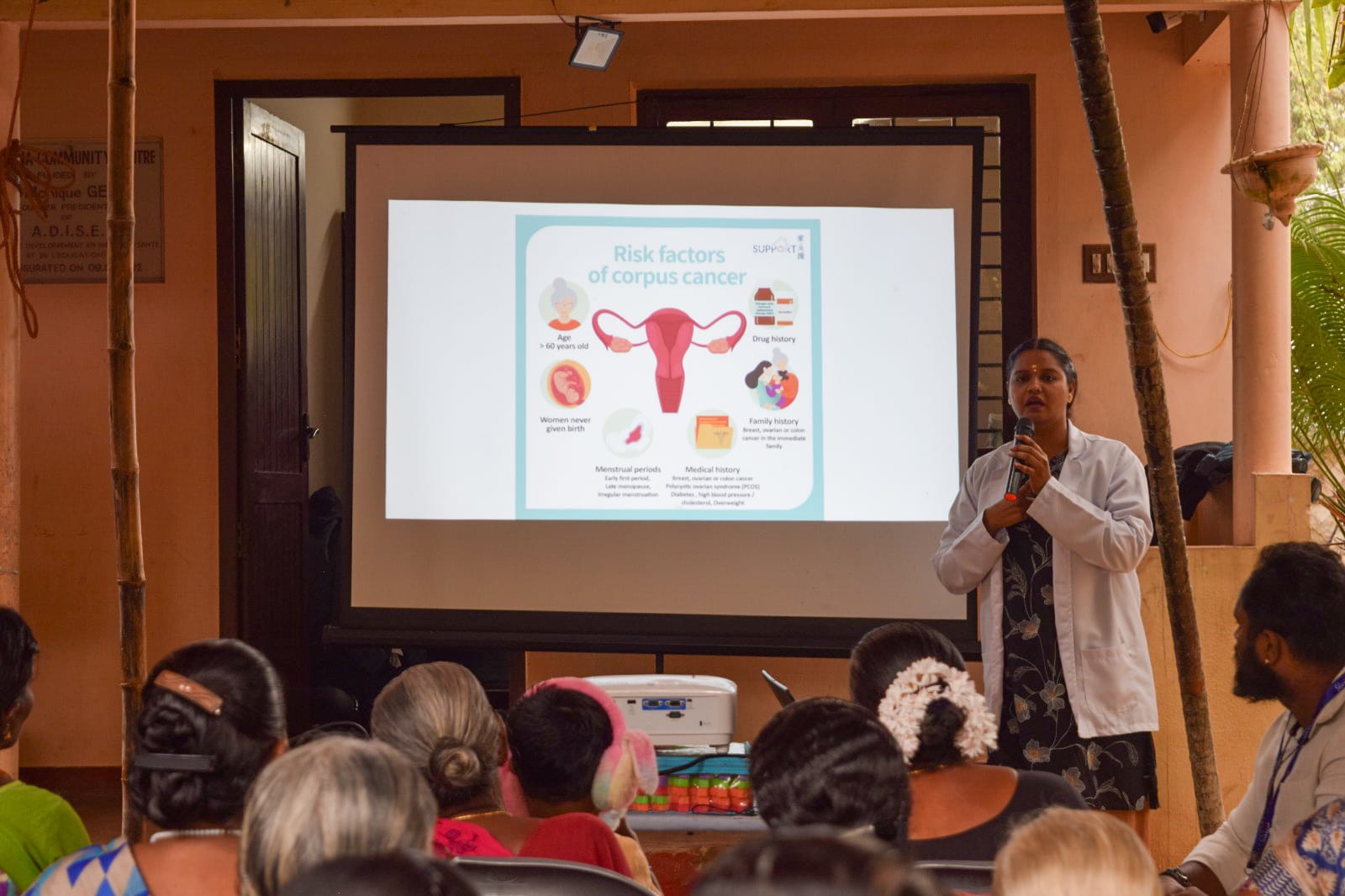 The awareness session was led by Dr. Sangavi, who presented key information on women-centric cancers in a clear, compassionate, and accessible manner. The session covered common and early symptoms, risk factors, and the importance of timely medical consultation. Particular emphasis was placed on self-detection and self-breast examination, enabling women to take an active role in monitoring their own health. The interactive format encouraged questions and open discussion, helping reduce fear, stigma, and misinformation surrounding cancer. Additionally, Mr. Bala, the organiser, spoke about various government schemes available to support treatment, helping participants understand the financial and practical assistance they can access.
