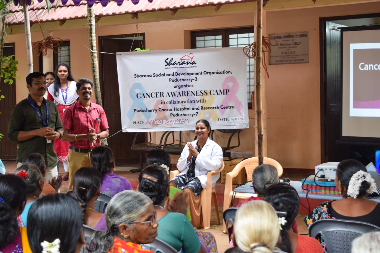 Guided by this approach, Sharana organised a Women-Centric Cancer Awareness and Screening Camp at Angalakuppam, in collaboration with the Puducherry Cancer Hospital and Research Centre. This partnership builds on earlier collaborations and marks the third cancer awareness camp organised jointly, reflecting a shared commitment to strengthening preventive healthcare at the community level. The Puducherry Cancer Hospital and Research Centre is a key referral institution in the region, providing specialised cancer diagnosis, treatment, emergency care, and follow-up services, while also actively engaging in community outreach and awareness programmes aimed at early detection and timely intervention.